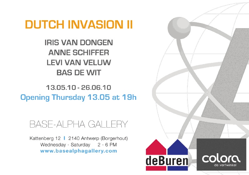 Base Aplha will showcase the work of Dutch Artists:Iris Van Dongen, Anne Schiffer, Levi Van Veluw, Bas De Wit 13 May 2010 - 26 June 2010, Opening Thu 13.05 at 19h Kattenberg 12, 2140 Antwerp/Borghout, Belgium +32 (0)3 295 86 36 I +32 (0)476 620 317 wed until fri 14h - 18h or by appointment www.basealphagallery.com www.antwerpart.be