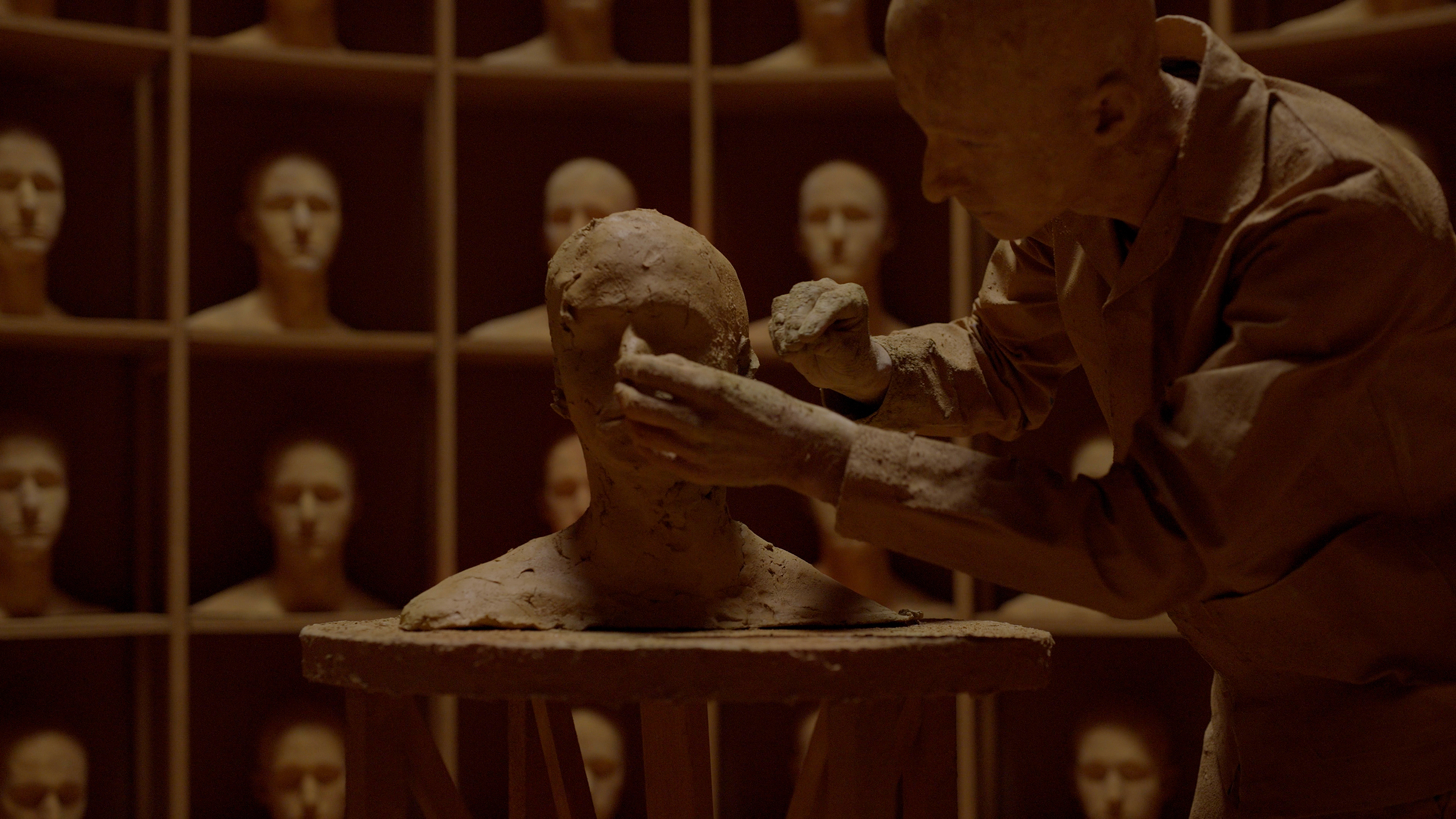 In the film, we see the artist, caught in a neurotic work-frenzy, modelling his own head in clay over and over again. As if in a feverish dream, he tries desperately to fill all the shelves in the cupboards behind him. Every time he thinks he has filled the last shelf, a new block of clay is already waiting for him and the process starts all over again. It is reminiscent of the myth of Sisyphus, in which the protagonist is condemned to constantly push a boulder up to the top of a hill, only for it to roll back to the bottom. Like Sisyphus, van Veluw is literally caught in the obsessive repetition of his creative urge. The creation of his own effigy is a quest for eternal youth or an impossible pursuit of immortality — an ambition that underlies every artist’s work.