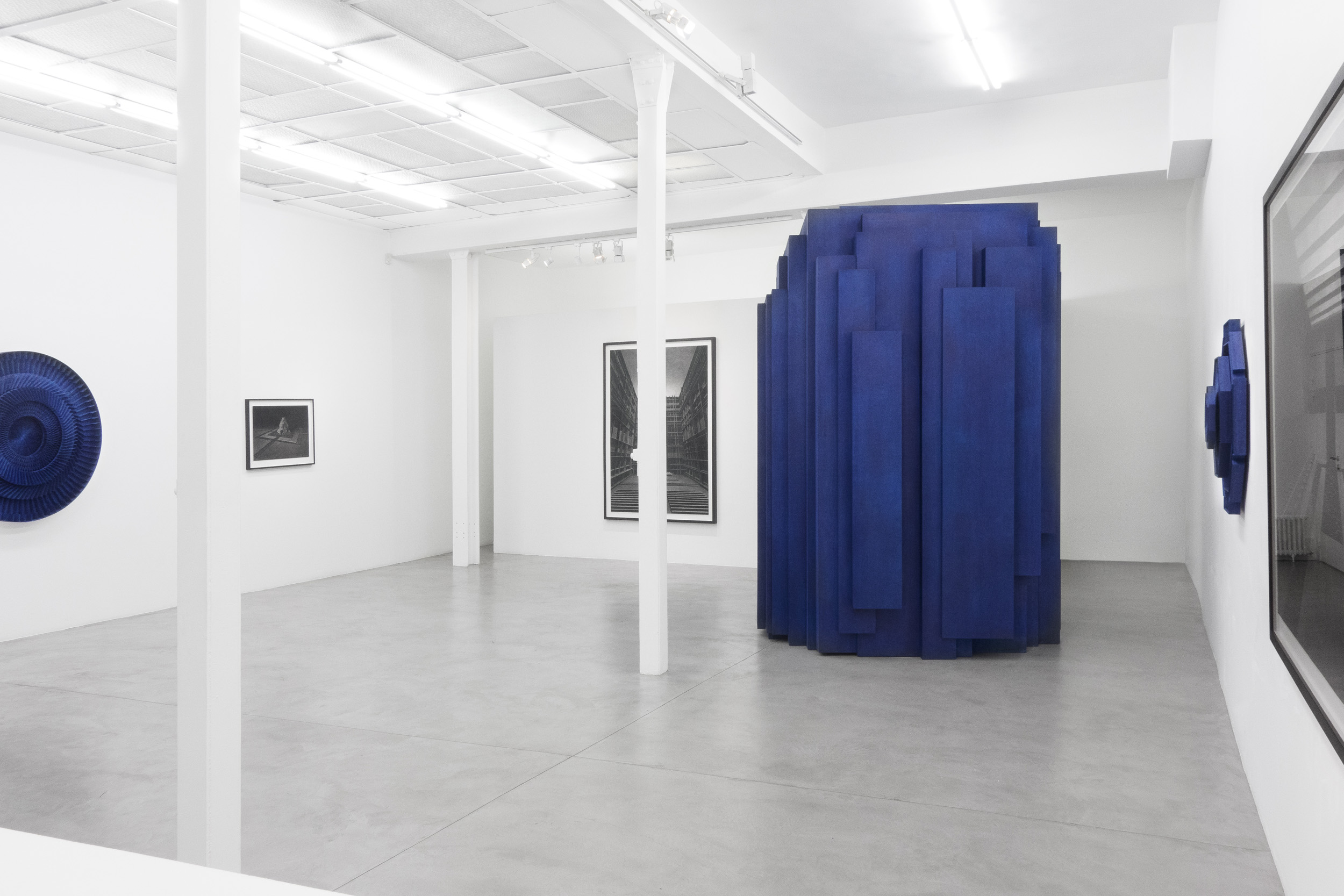 The core of the exhibition consists of a mysterious deep blue object, an asymmetrical structure constructed from vertical upright blocks; the Chapel. In this installation, van Veluw plays with a variety of archetypal religious elements that seduce the spectator into exposing themselves to a new faith of sorts. In the ceiling, there is a large open hole. The hole creates a connection with the sky, builds a bridge between the earthly and the spiritual. A beam of light falls through the opening onto an altar that consists of a detailed network of grids, squares and openings. Strewn around the altar are tiny crumbled fragments of blue stone, suggesting an unknown ritual of sorts whose function remains unexplained.