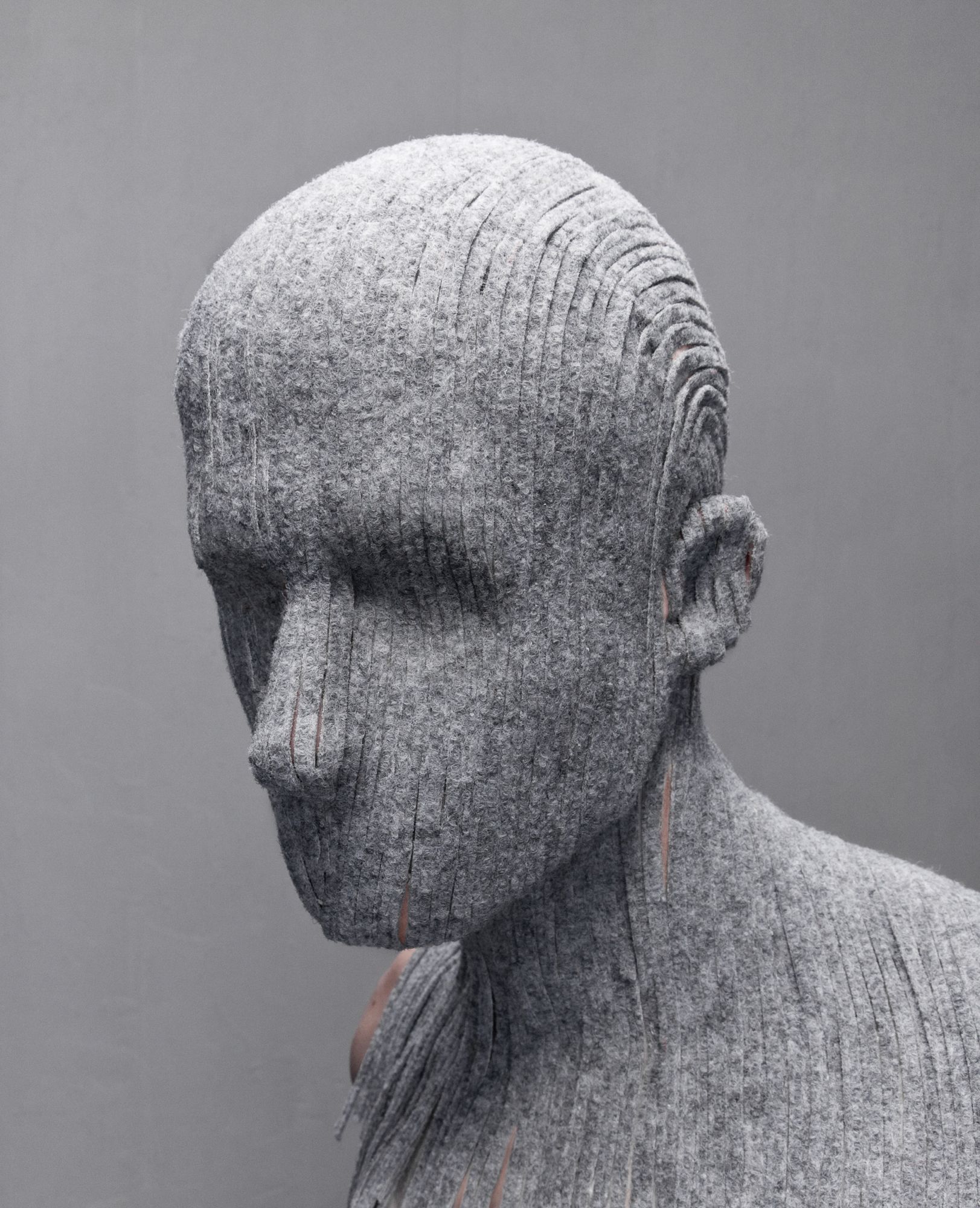 In the Material Transfer series, Levi van Veluw utilises commonplace materials such as strips of carpet, pebble stones and sterling board chips. By applying these materials to his head and face he emphasises their aesthetic and formal qualities. This subverts the metaphoric meaning we usually assign to them in daily life. In this way Van Veluw focuses attention on how we perceive and experience the objects and materials around us.